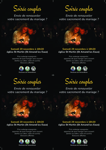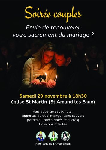 Grande première cette année pour tous les couples mariés nos 3 paroisses de l'Amandinois : vous êtes invités à renouvellement le "OUI" de votre sacrement du mariage au cours d'un temps de prière et de bénédiction à l'église St Martin le 29 novembre 18h30, veille du 1er dimanche de l'année liturgique. Ce temps sera suivi d'une auberge espagnole à la salle St Amand.
